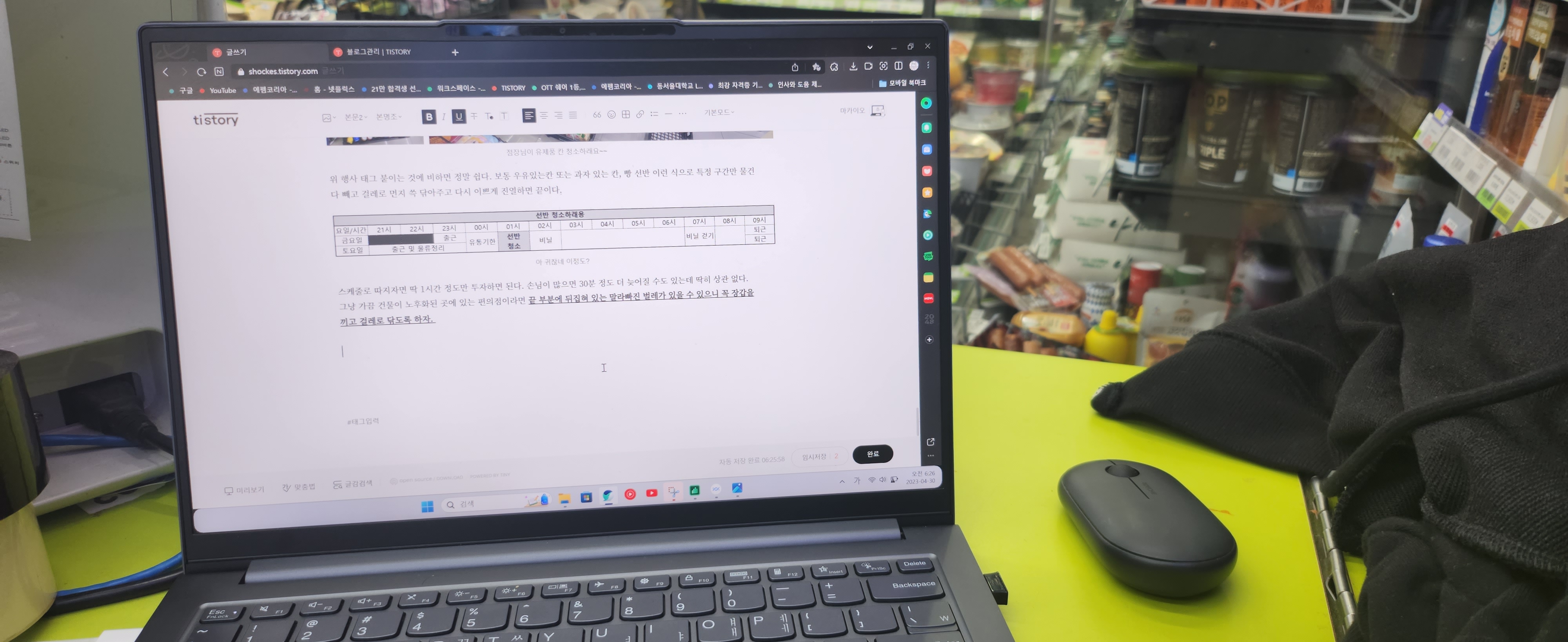 세상이 참 좁은 것이, 몇 개월 전 내가 들어갈 금,토 야간타임에 바로 친구가 3개월 정도 일했었다고 한다. 끝은 좋지 않았다고하지만 친구피셜로 사람 더럽게 안온다는 장담까지 할 정도로 위치가 매우 인상적인 편의점이었기에, 꼴에 대학생이라고이것저것 개인활동이 보장된 좋은 곳이라고 판단했기 때문이었다.